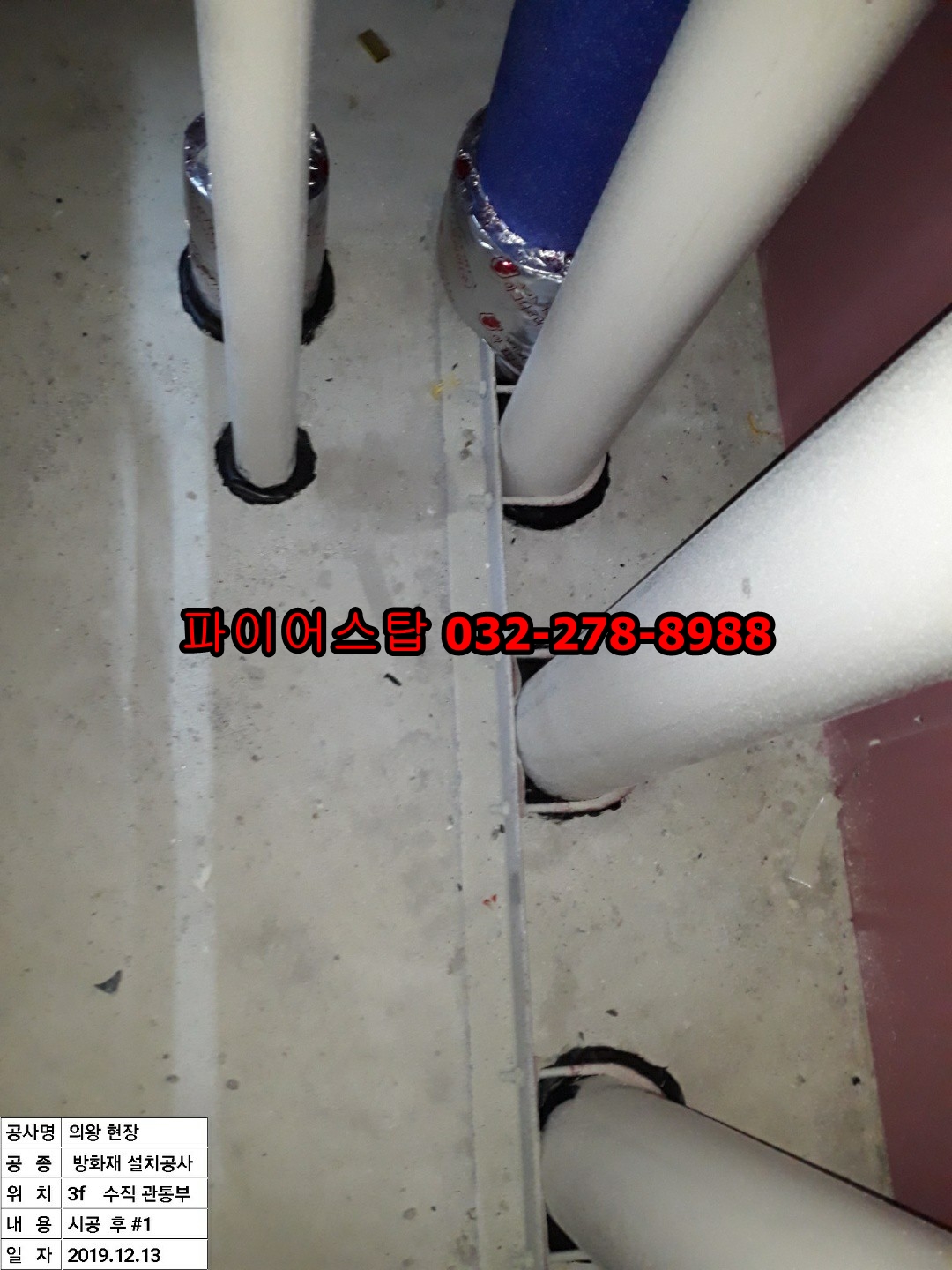 경기도 의왕시 이동의 신축현장에서 설비소방내화충전공사를 진행했습니다(19/12). 3F