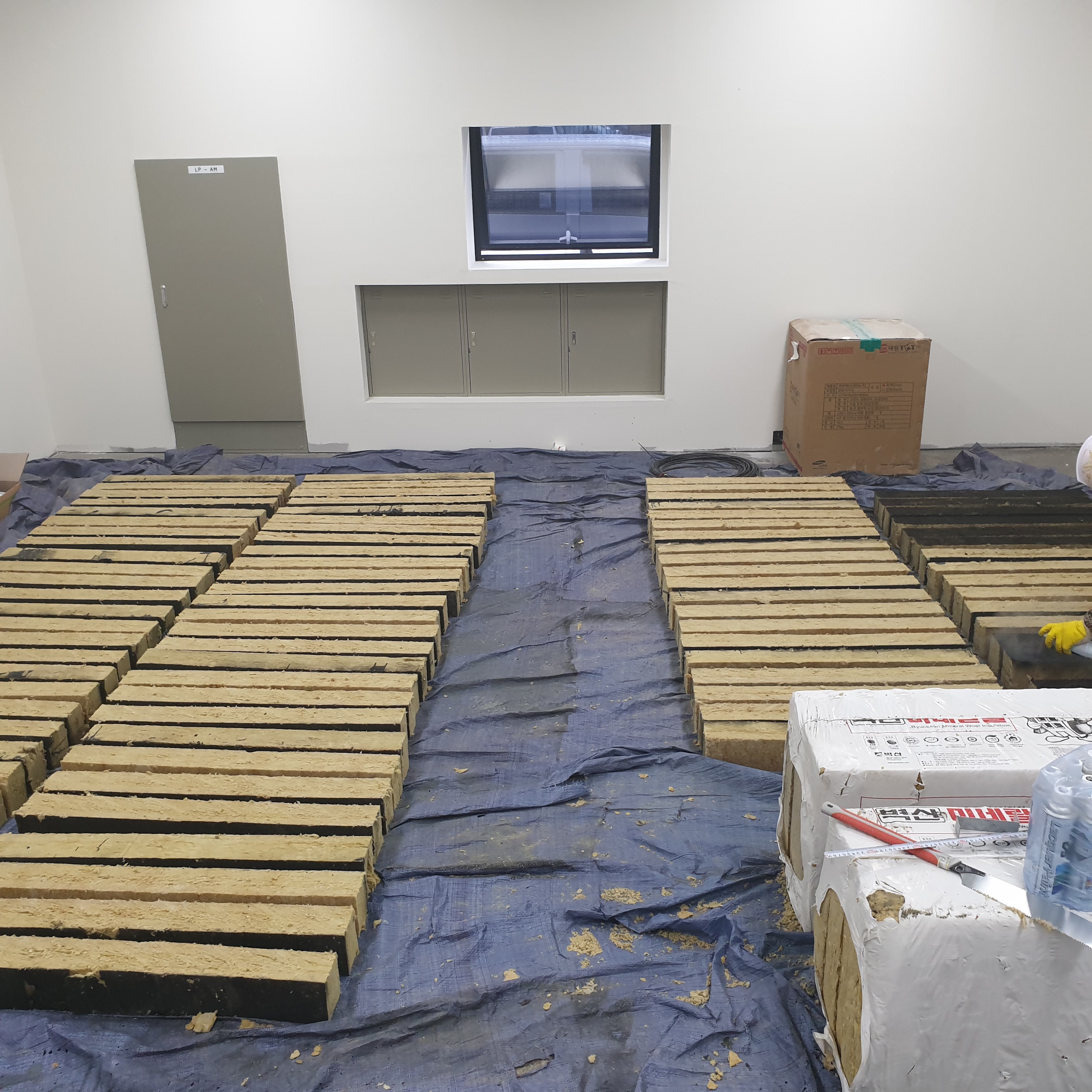 1. 커튼월 층간방화의 미네랄울이며, 발주처에서 요청하여 바깥면부분에 락카를 도포하였습니다.